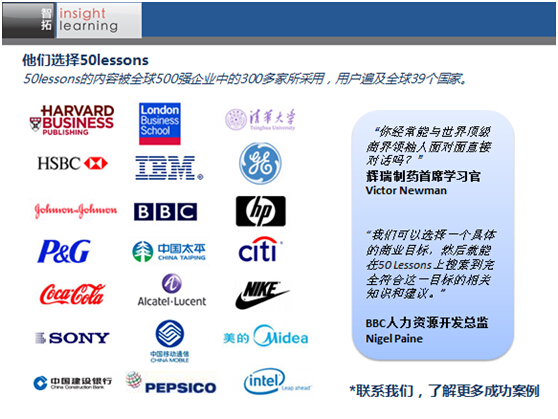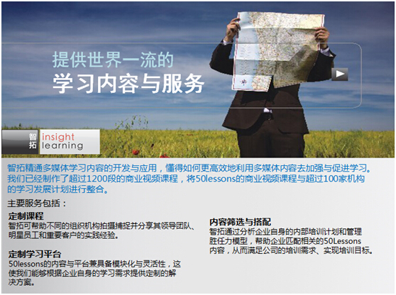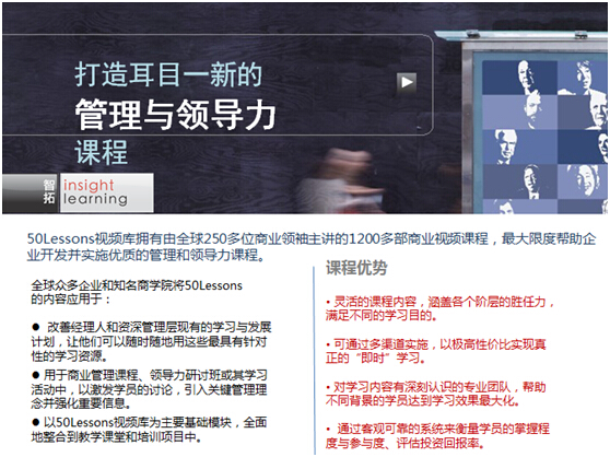 50LESSONS是全球最大的商业领袖视频课程资料库,目前已制作超过250位知名国际商业领袖主讲的1200个视频课程。2008年智拓将50LESSONS课程带到中国,凭借我们卓越的专注和持续的创新,50lessons课程在中国获得了众多领先企业的认可。我们的客户包括中国移动、中国电信、中国联通、上海贝尔、DHL、首都机场、建行银行、交通银行、汇丰银行、太平保险、西安杨森、美的集团等等。