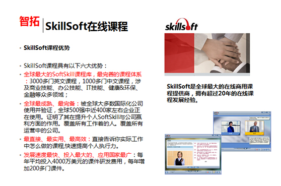 Skillsoft课程是世界一流的权威在线学习内容,完善的课程体系,课程覆盖面宽,涉及22个门类、提供超过1000门中文在线课程,是当今世界上内容最全面、应用最广泛的课程库。