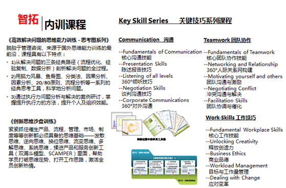 提供管理案例与经验学习的互动教学课堂。包括智拓Key Skills Series课程,以及版权课程"思考图"与创新思维课程。